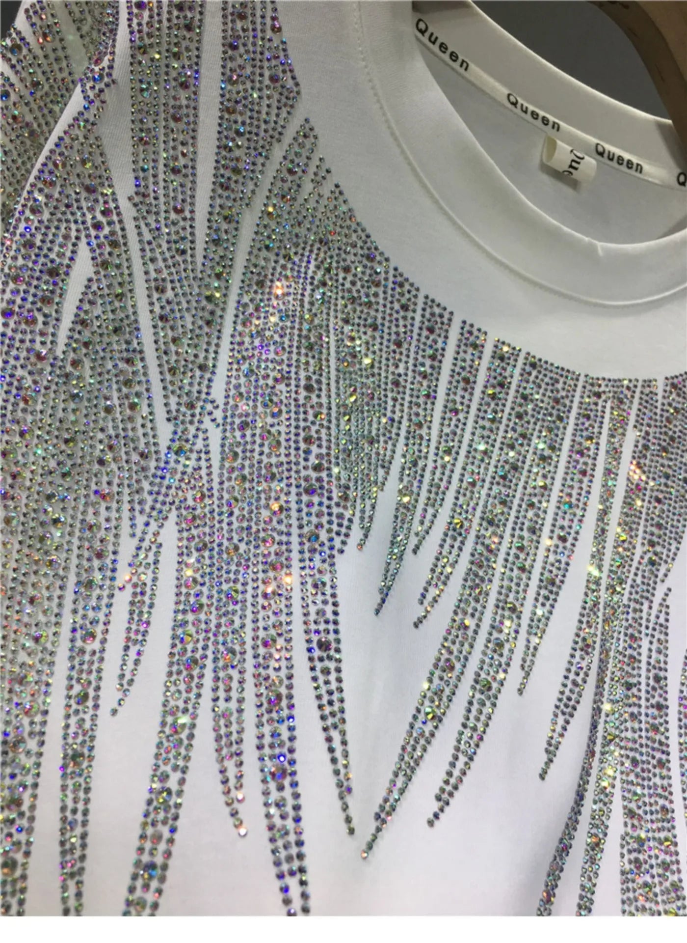 Women Tops Sequin Print Tees Round Neck Half Sleeve Loose Casual Regular Splice T Shirts Simple Hot Drilling Mid Length Top