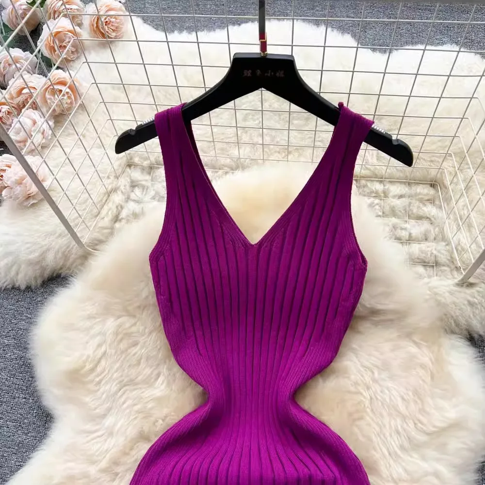 Women V Neck Solid Ribben Knitted Dresses Casual All Match Slimple Sexy Package Hips Bodycon Dress Elegant Vestidos Streetwear