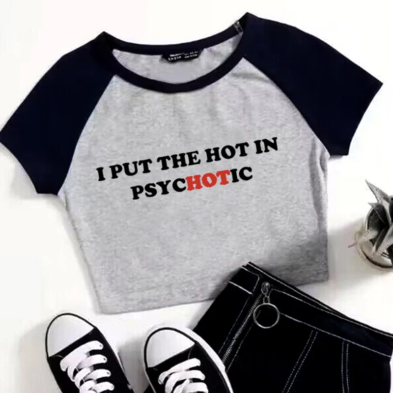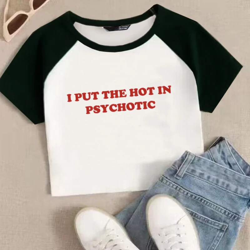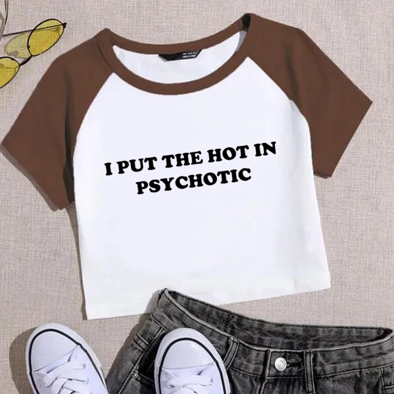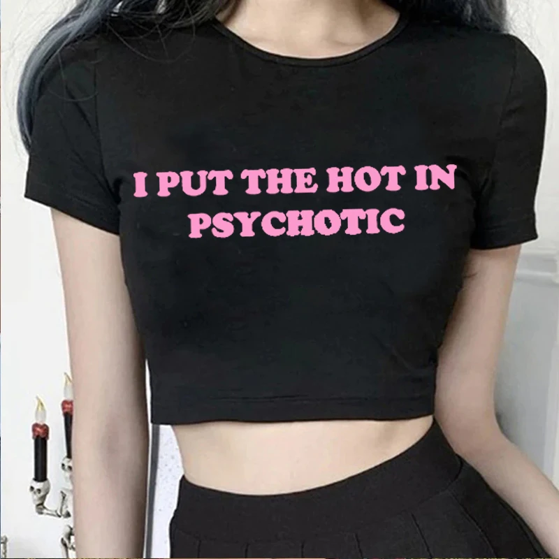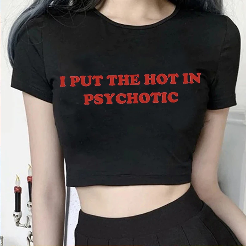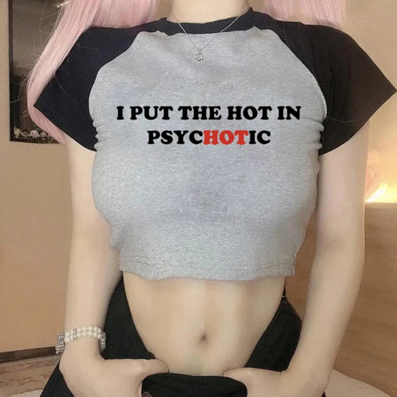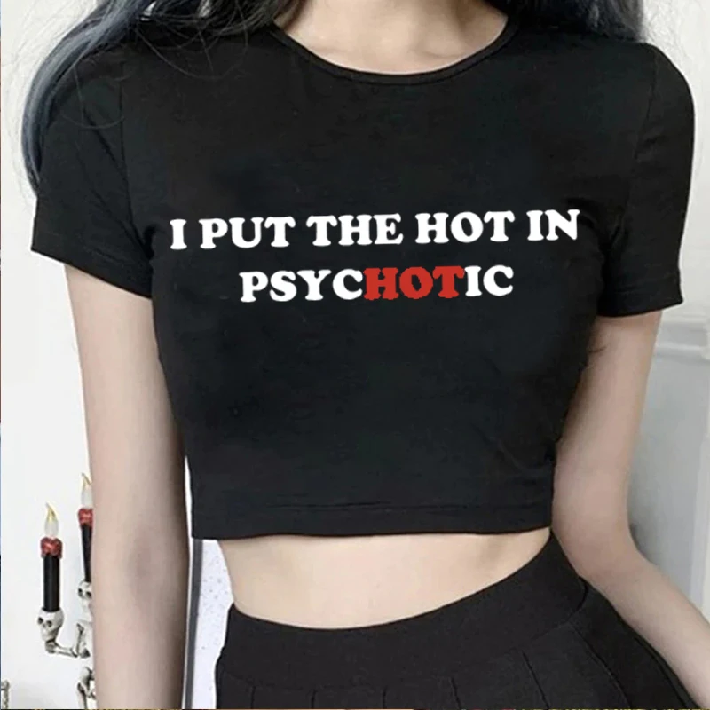 Women Vintage T Shirt I Put the Hot in Psychotic Letter Graphic Y2k Crop Tops Cute Baby Tee 2000s E-Girl Streetwear Summer Tee