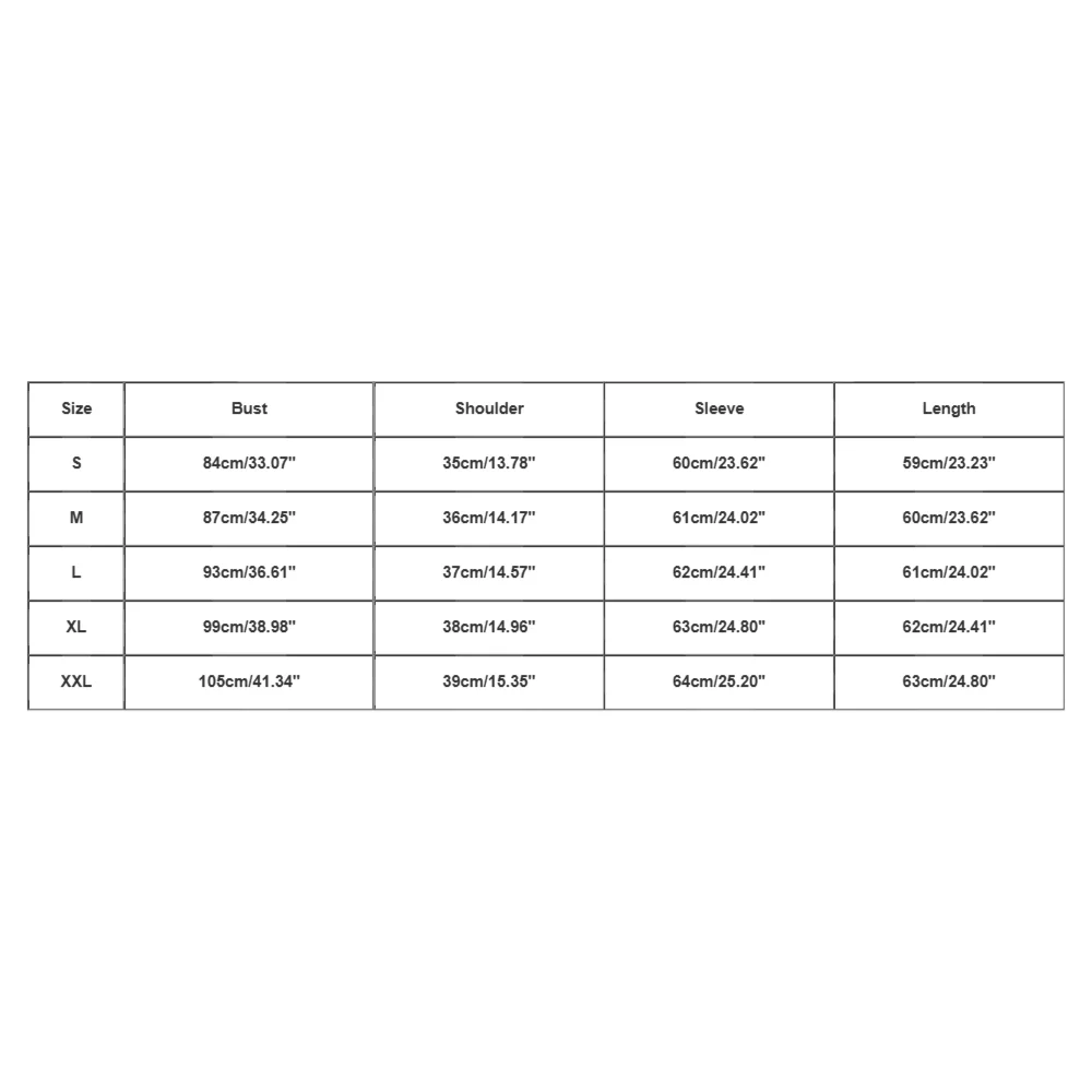 | Size:XXL | Bust:105cm/41.34'' | Shoulder:39cm/15.35'' | Sleeve:64cm/25.20'' | Length:63cm/24.80'' |