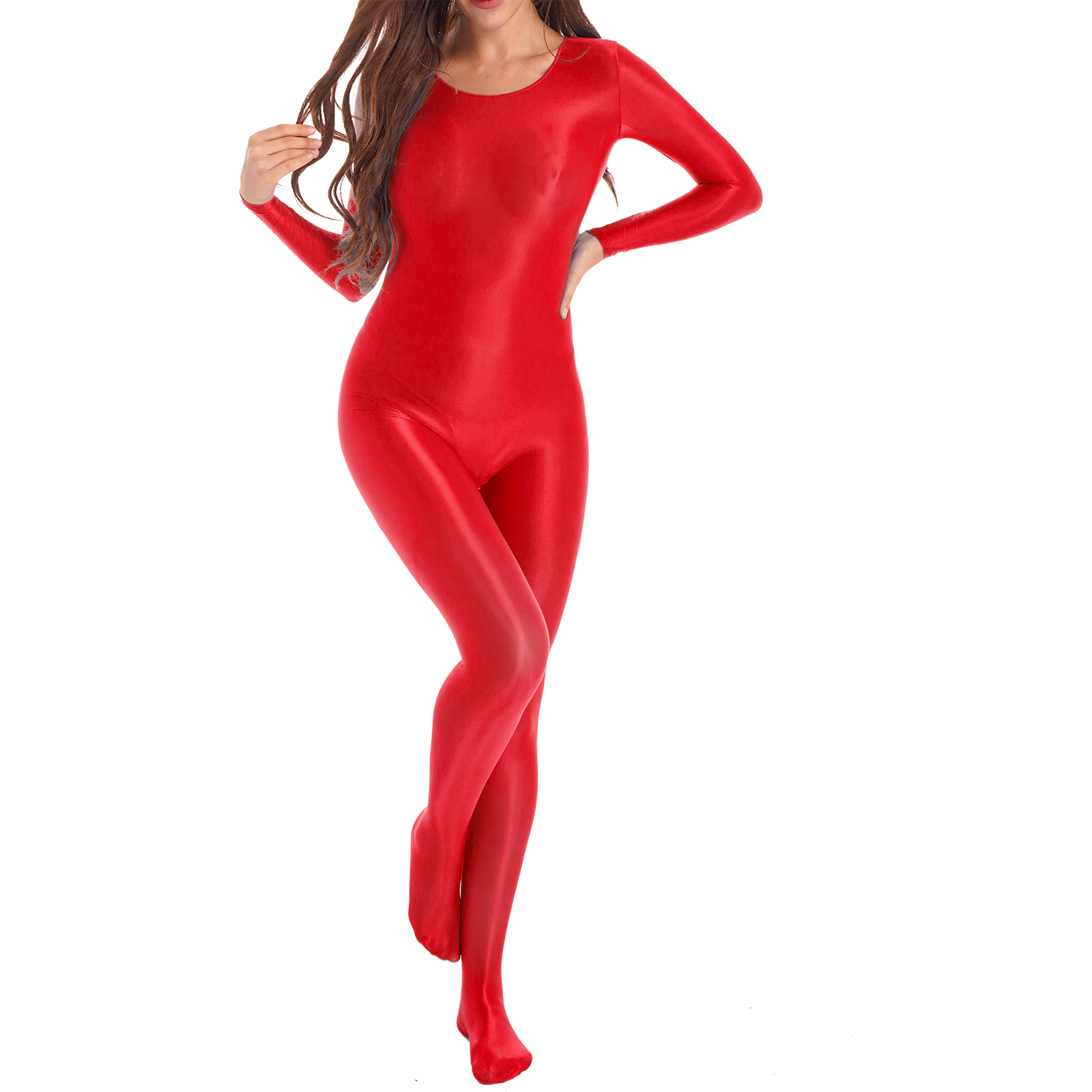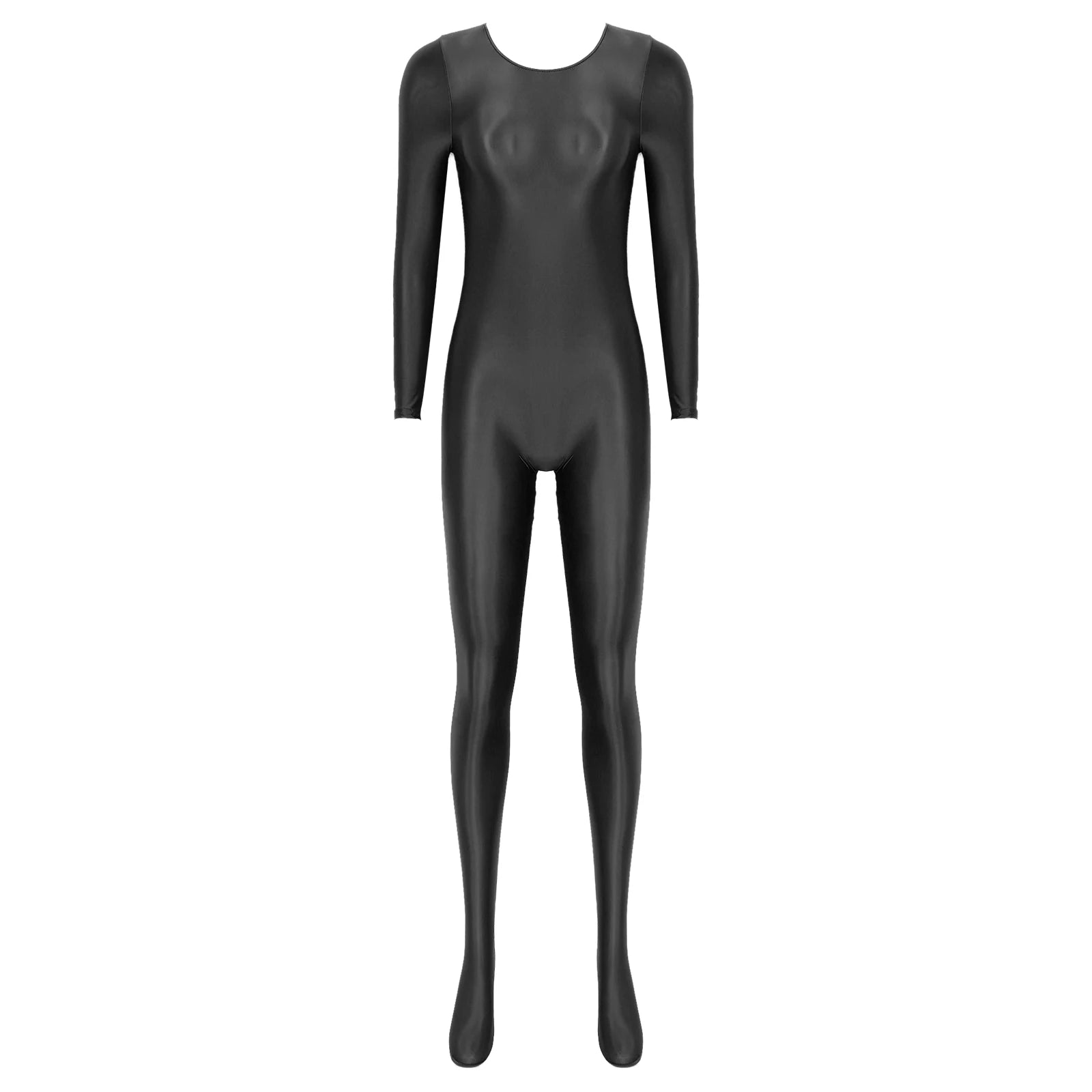 Womens Oil Glossy Bodysuit One Piece Swimwear Long Sleeve Teddies Stretchy Jumpsuit Bodystocking Rave Party Clubwear Swimwear