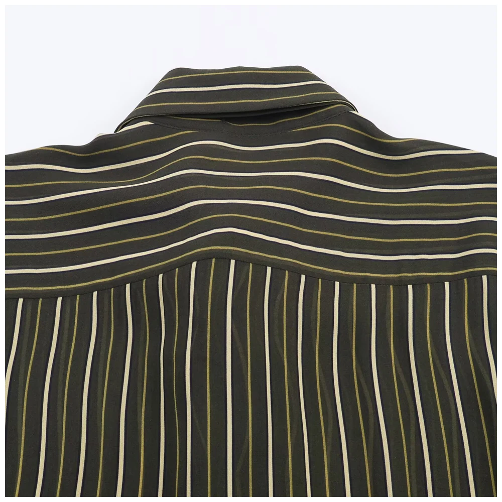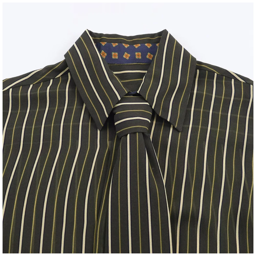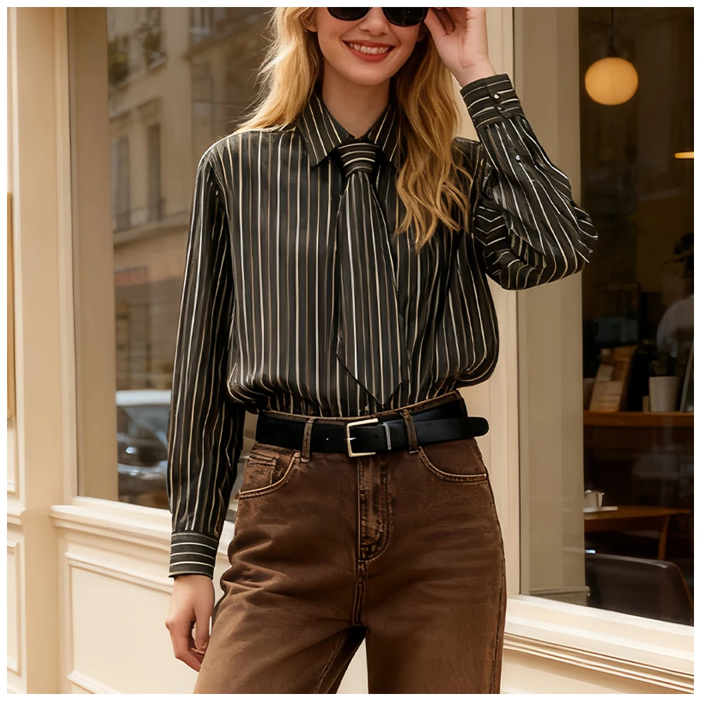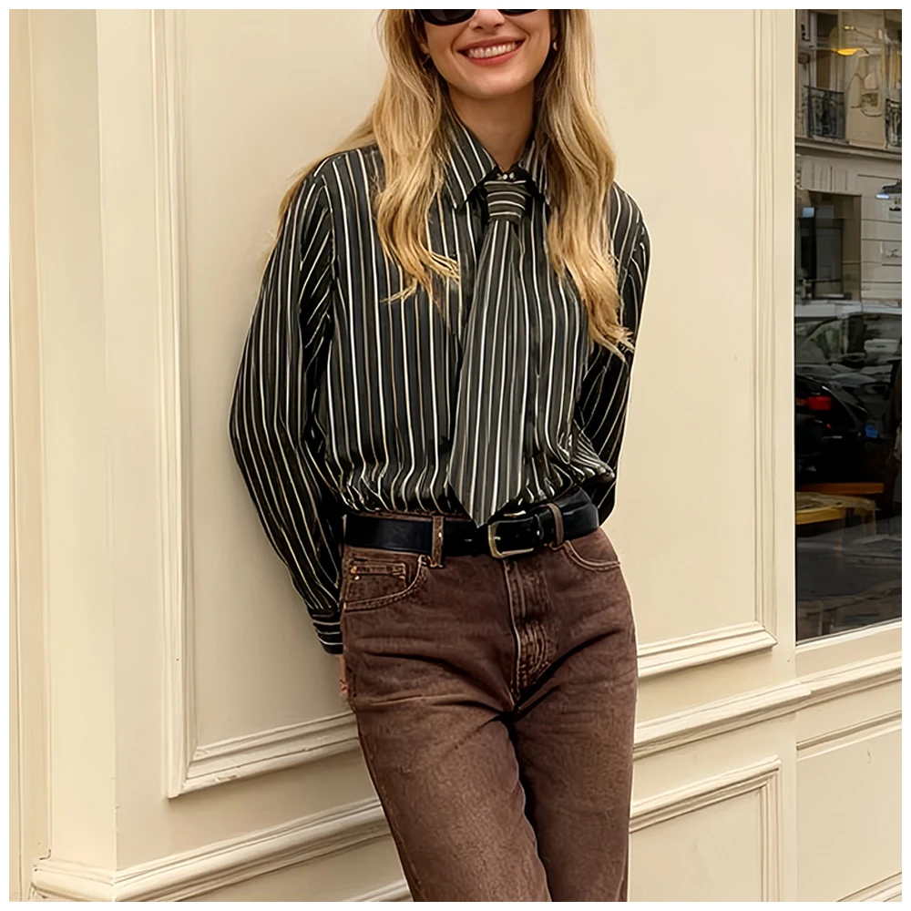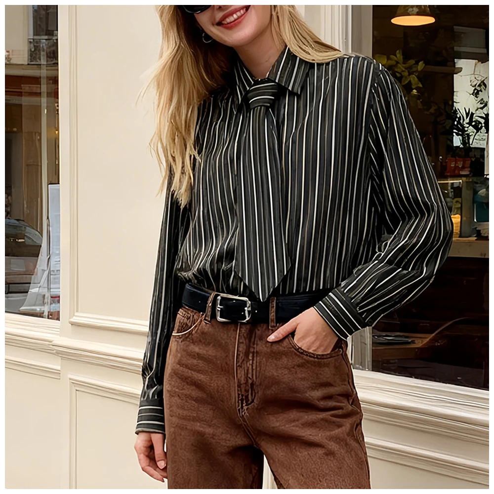 Womens Striped Shirt With Tie And Turn Down Collar Long Sleeves Fashionable And Versatile A Must Have Item For Spring And Autumn