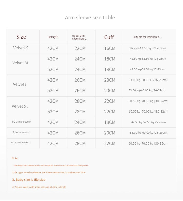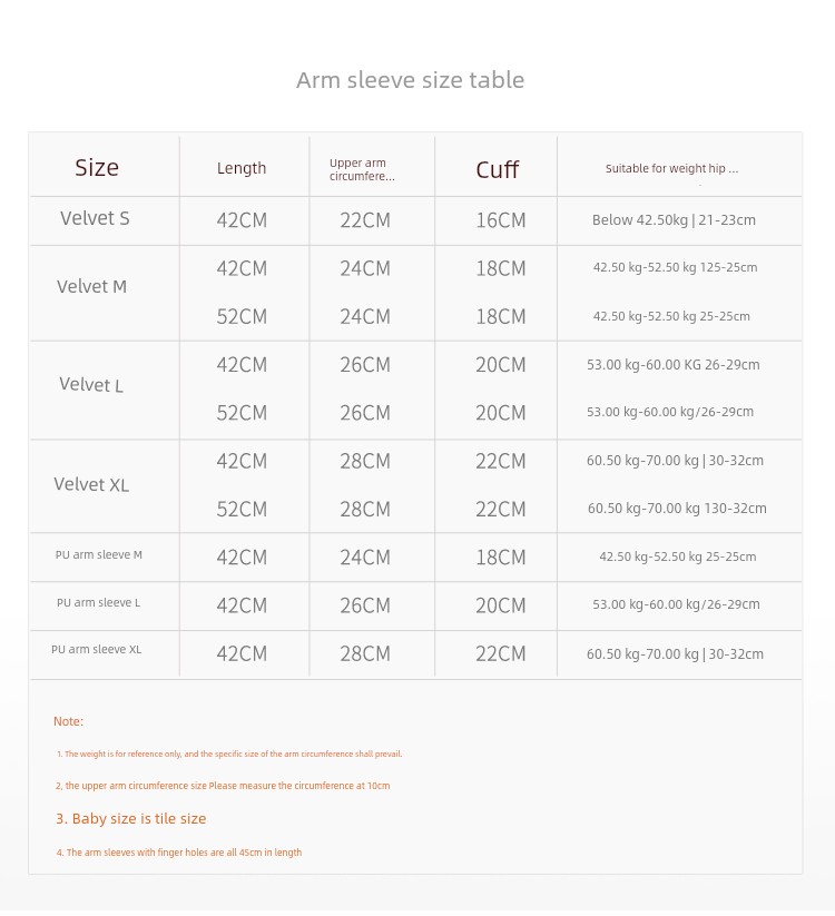 1. Velvet oversleeves have two lengths: 42cm and 52cm. 42cm is suitable for MM with a height of 155-165 (MM with a height of 160 is about to the middle of the big arm)