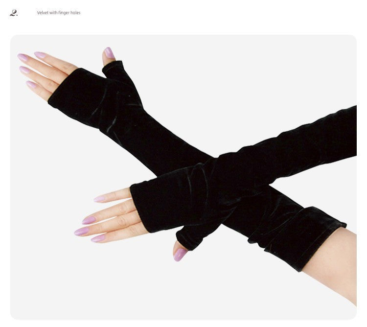 Women's Velvet Open Finger Black Oversleeve Leather Gloves