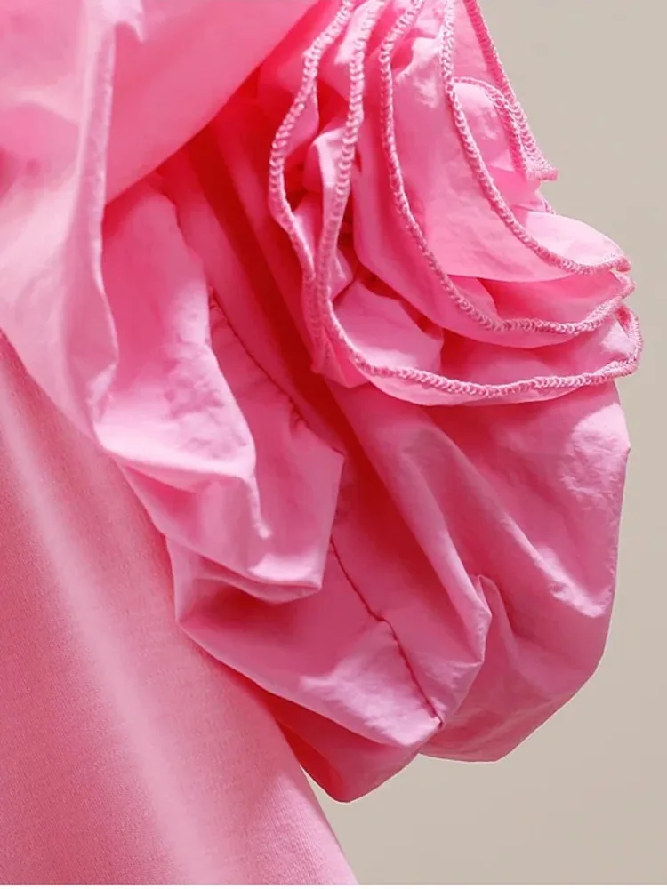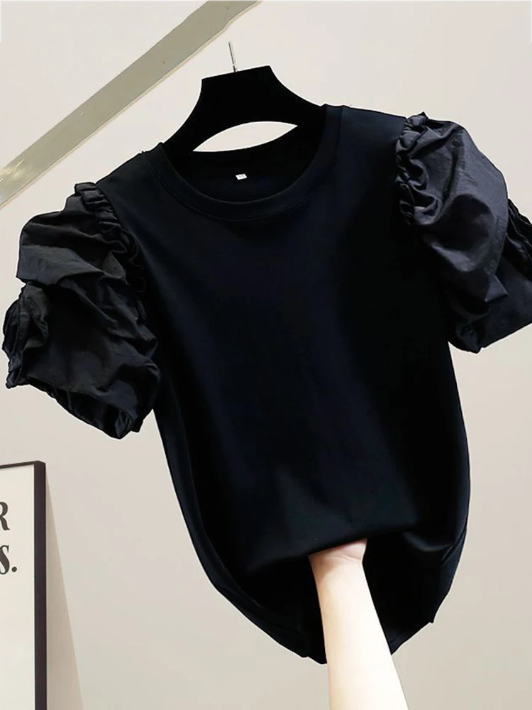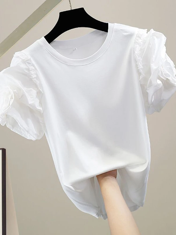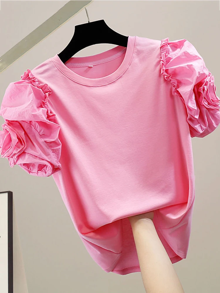 XFPV Women Three-dimensional Flower Wooden Ear Edge Patchwork T-shirt Puff Short Sleeve Fashion Sweet Korea Tide Summer 2023