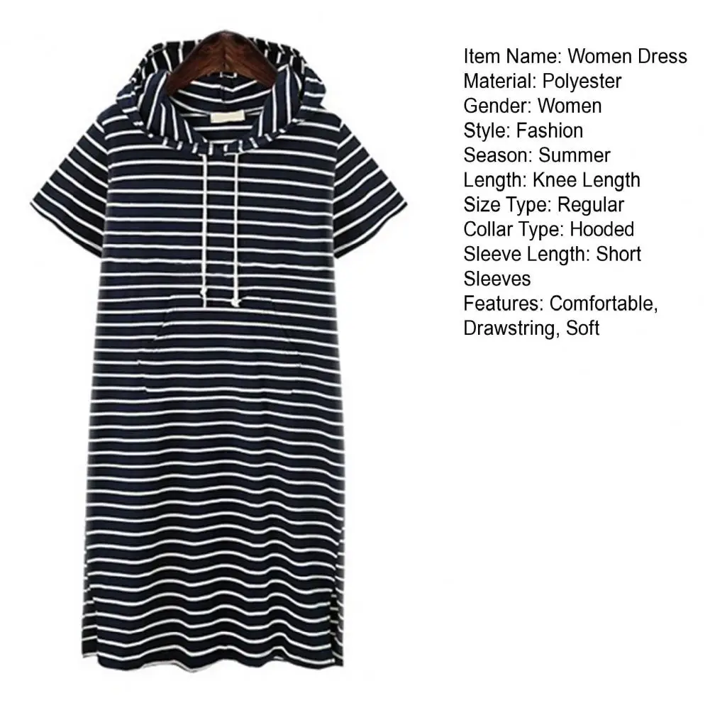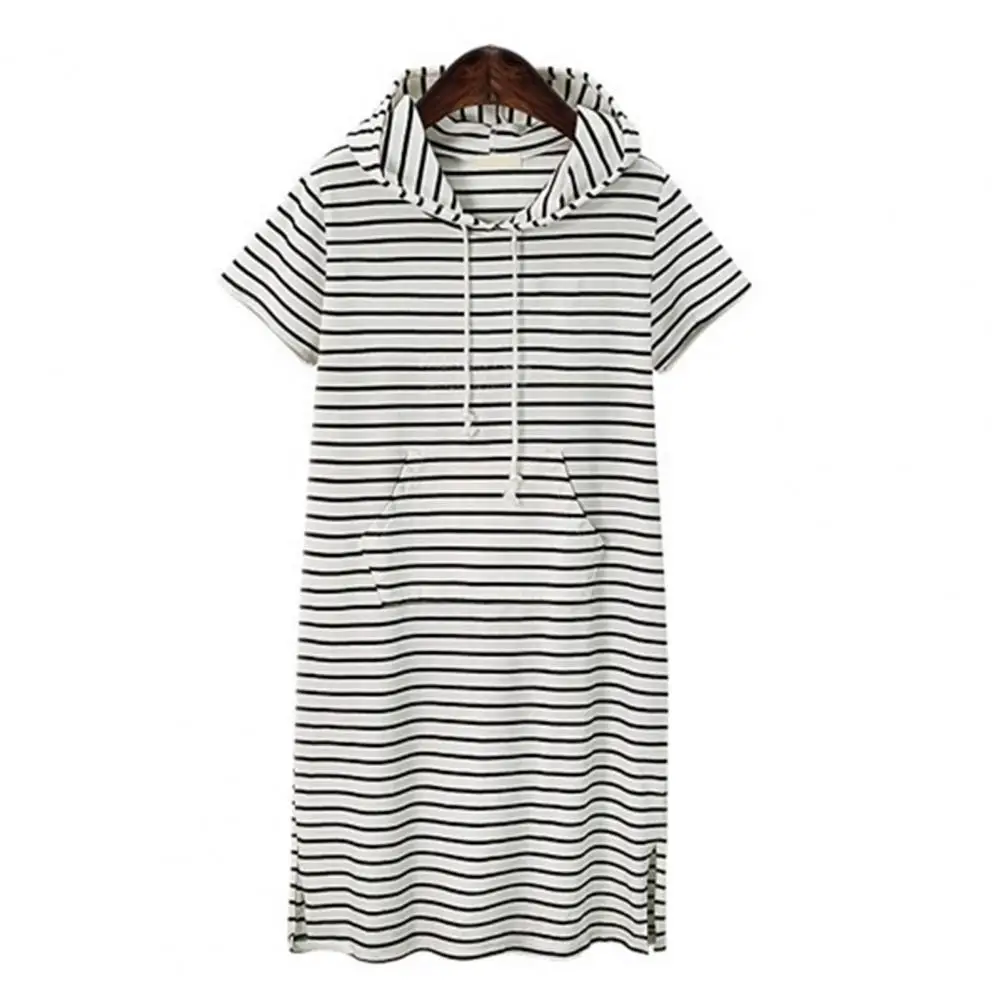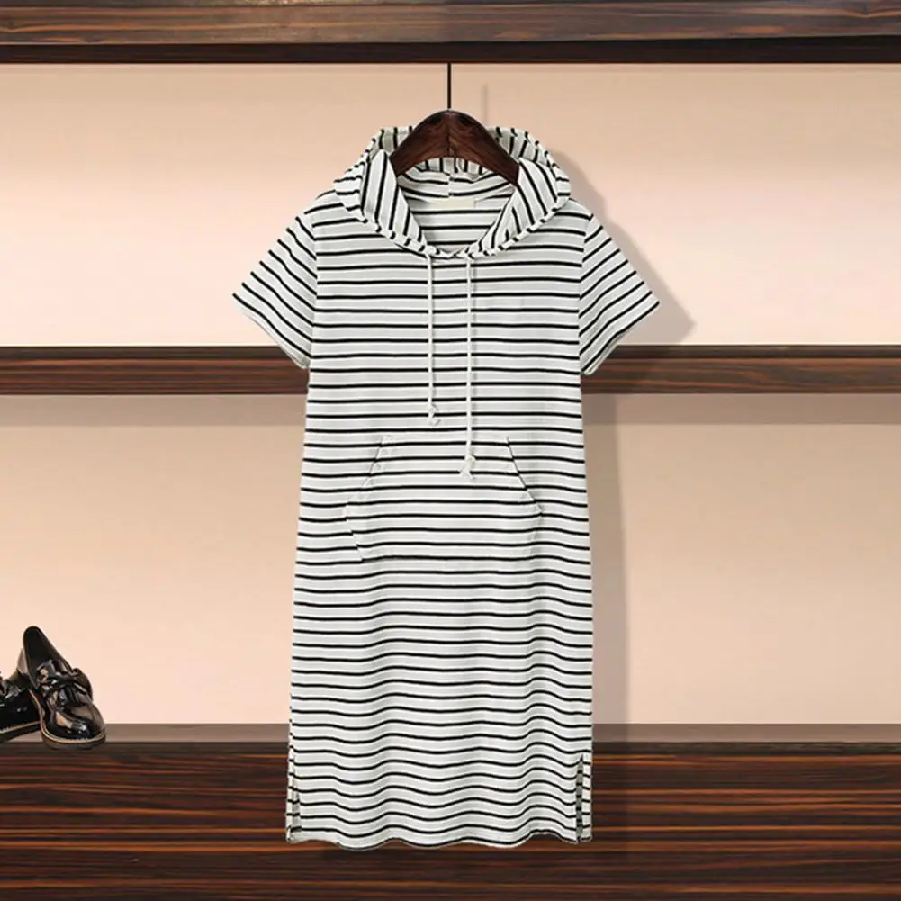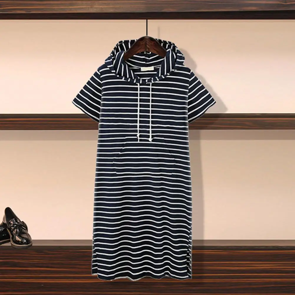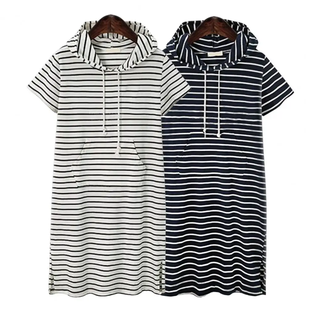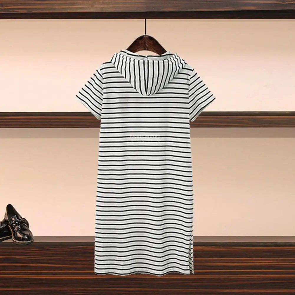 Women Dress Hooded Drawstring Sports Style Short Sleeves Striped Plus Size Loose Fit Summer Casual Dress Daily Wear