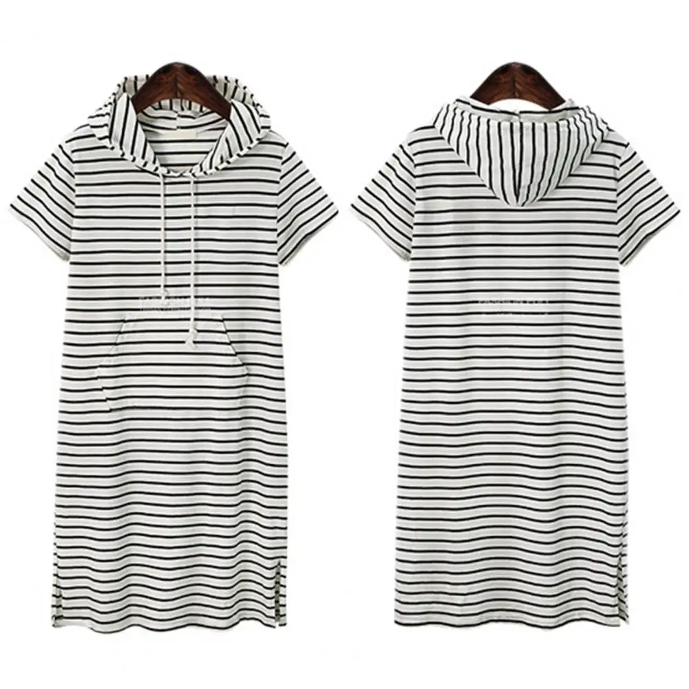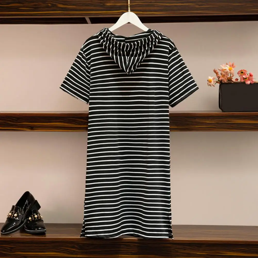XL-5XL Women Dress Hooded Drawstring Sports Style Short Sleeves Striped Plus Size Loose Fit Summer Casual Dress vestido feminino