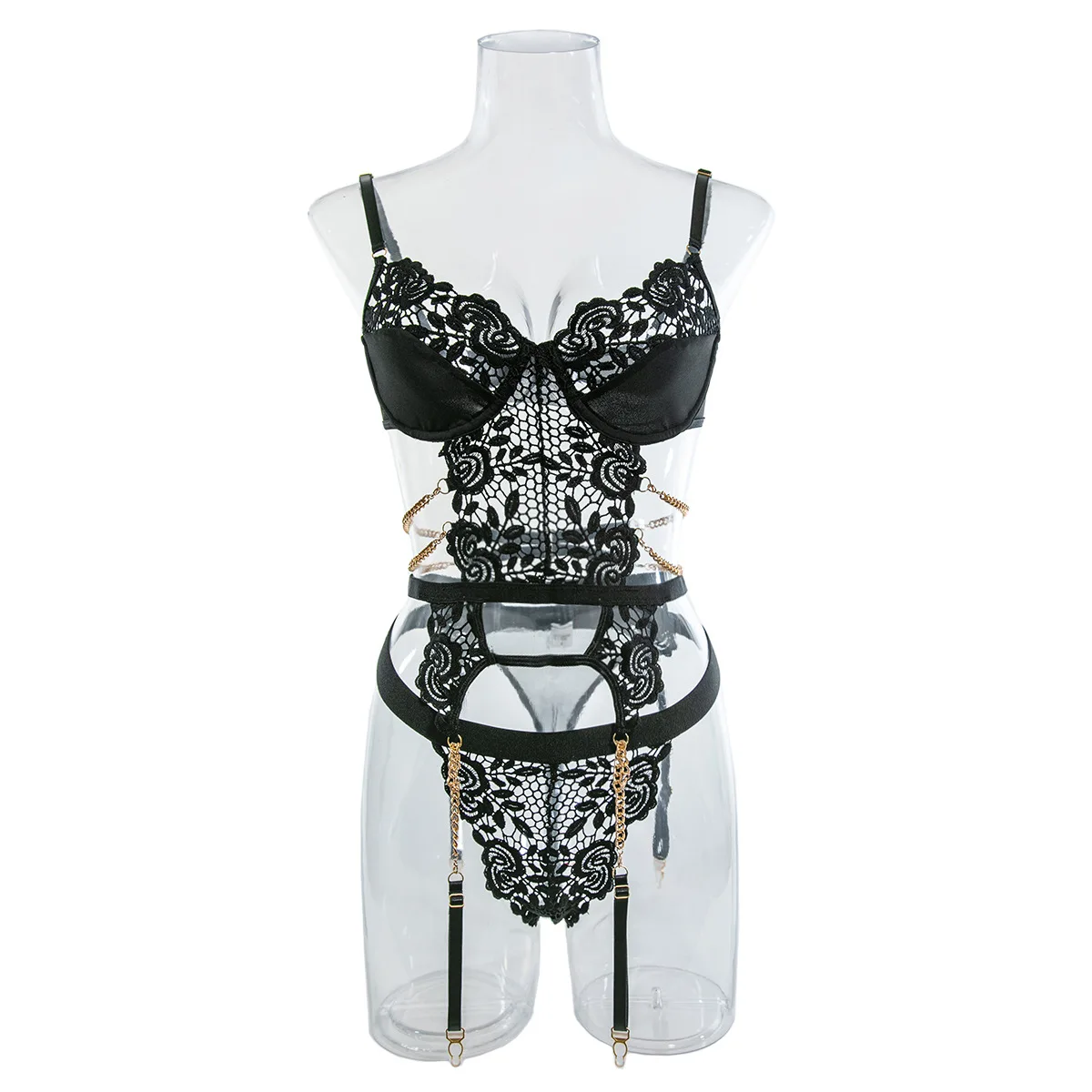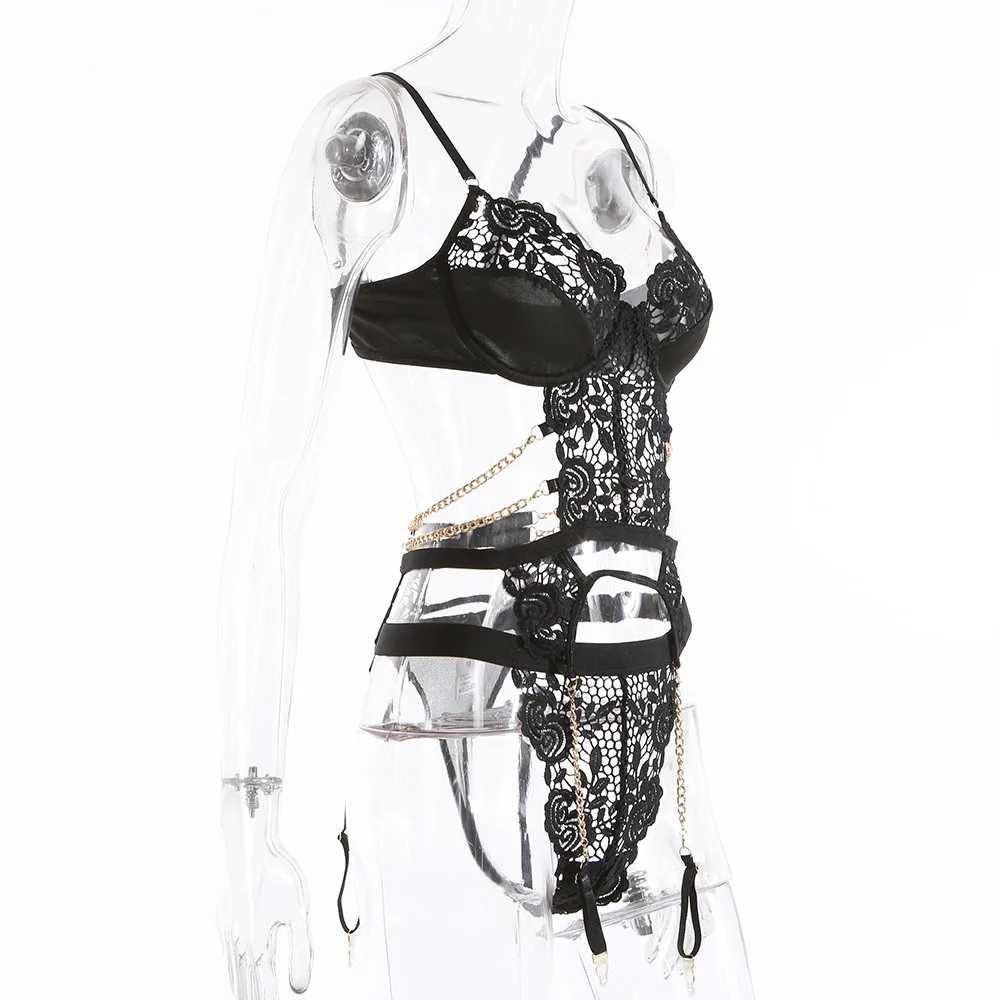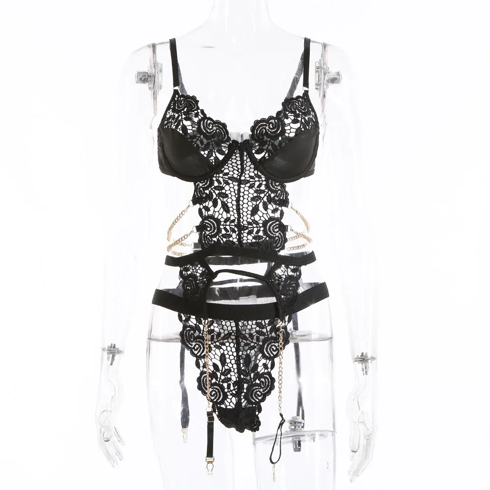 Yimunancy 2-Piece Flroal Lace Erotic Set Women Cut Out Fashion Chain Decorated Lingerie Set Sexy Brief Kit