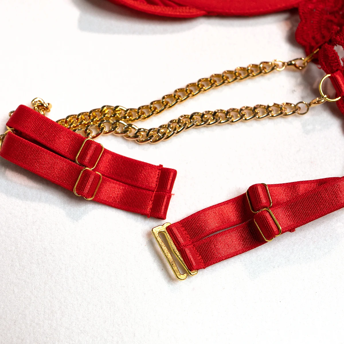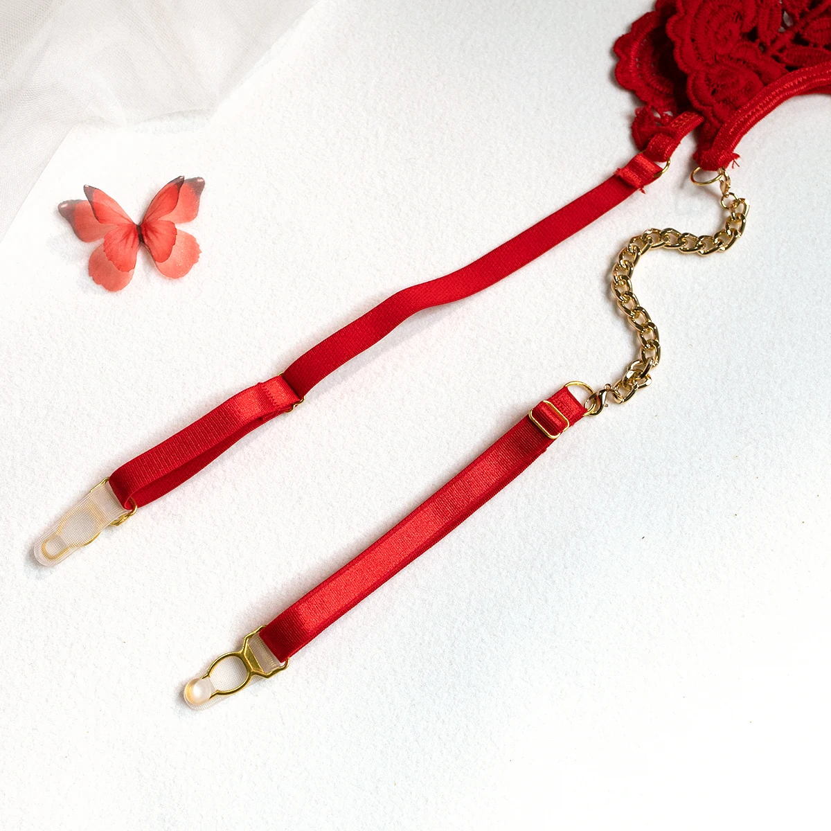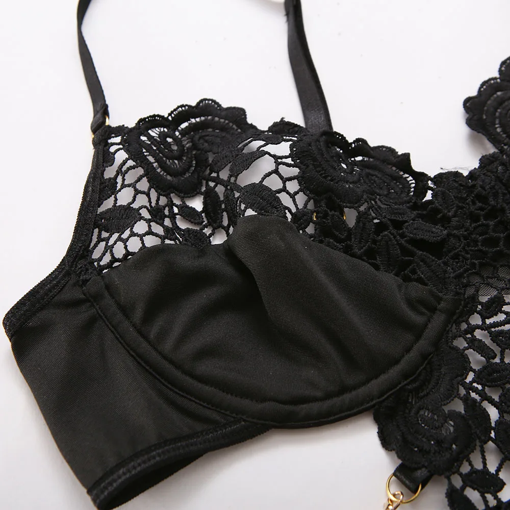 Yimunancy 2-Piece Flroal Lace Erotic Set Women Cut Out Fashion Chain Decorated Lingerie Set Sexy Brief Kit