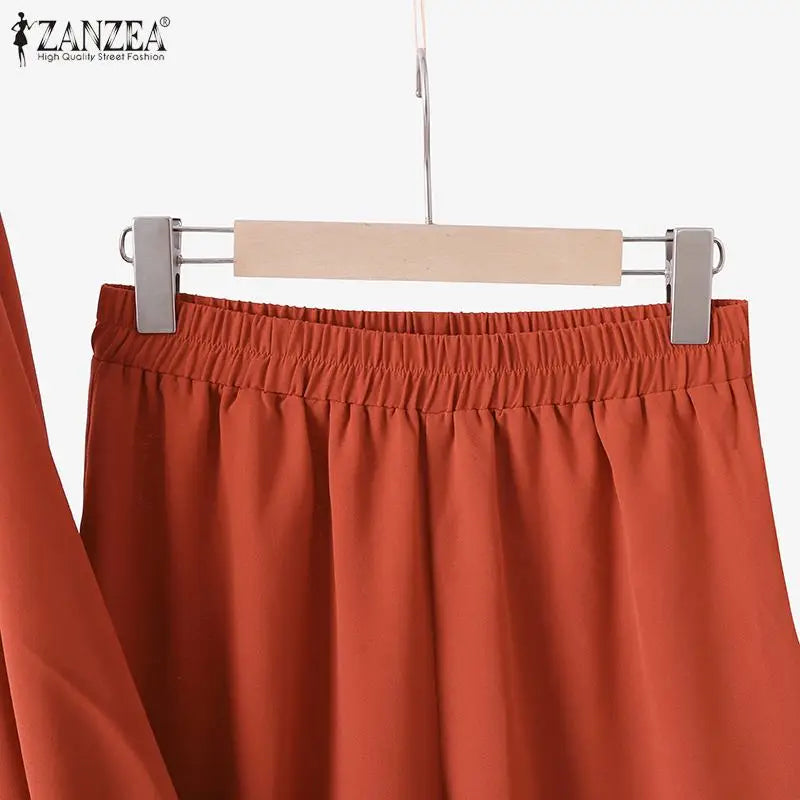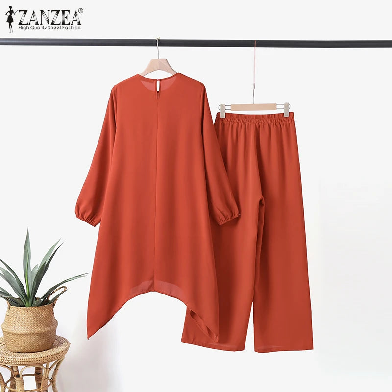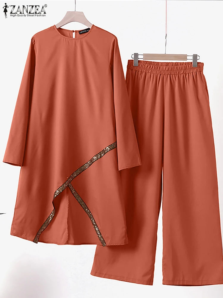 ZANZEA Fashion Tracksuit Muslim Women Long Sleeve Blouse Abaya Suits Sequins Islamic Clothing Loose Matching Sets 2PCS